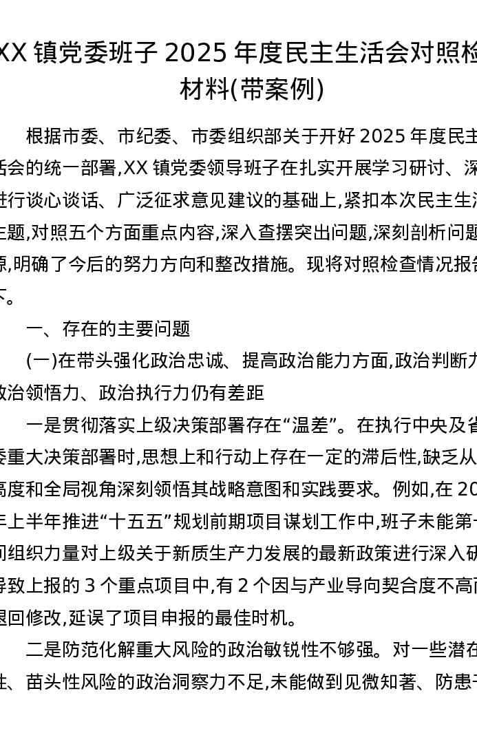 XX镇党委班子2025年度xxxxx对照检查材料(带案例)(五个带头)