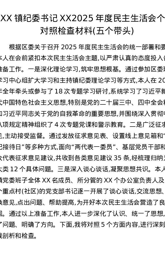 XX镇纪委书记XX2025年度xxxxx个人对照检查材料(五个带头)
