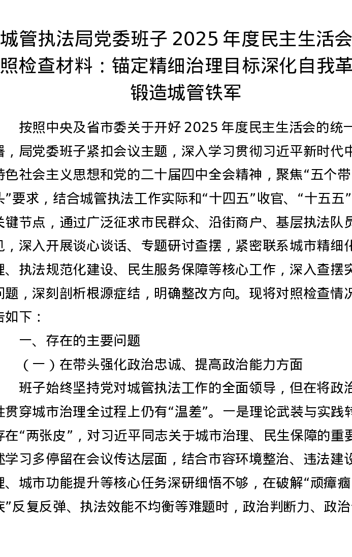 城管执法局党委班子2025年度五个带头xxxxx对照检查材料:锚定精细治理目标 深化自我革命 锻造城管铁军
