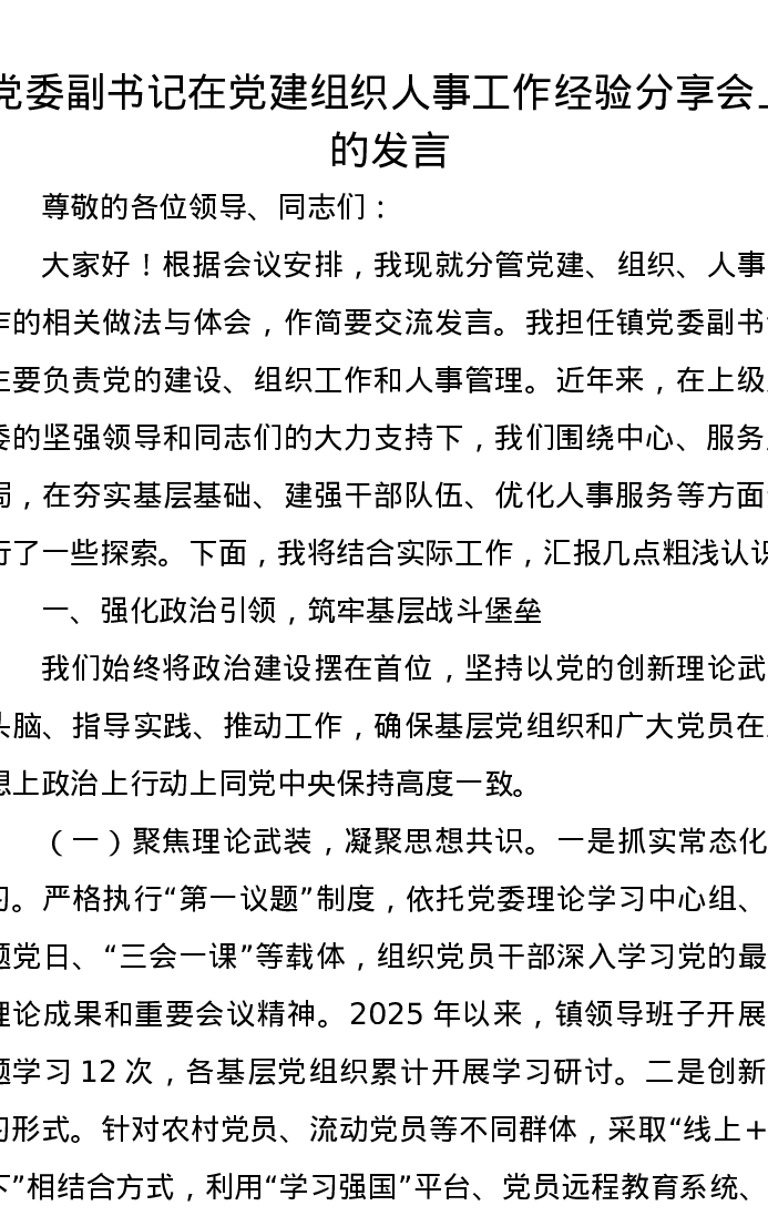 党委副书记在党建组织人事工作经验分享会上的发言