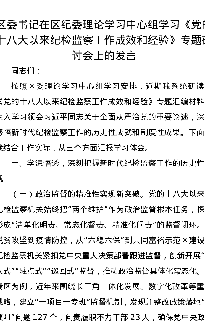 区委书记在区纪委理论学习中心组学习《党的十八大以来纪检监察工作成效和经验》专题研讨会上的发言