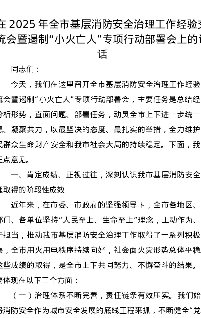在2025年全市基层消防安全治理工作经验交流会暨遏制小火亡人专项行动部署会上的讲话
