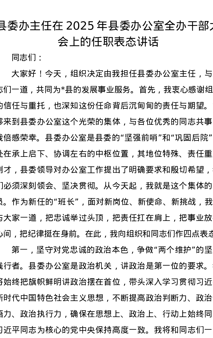 县委办主任在2025年县委办公室全办干部大会上的任职表态讲话