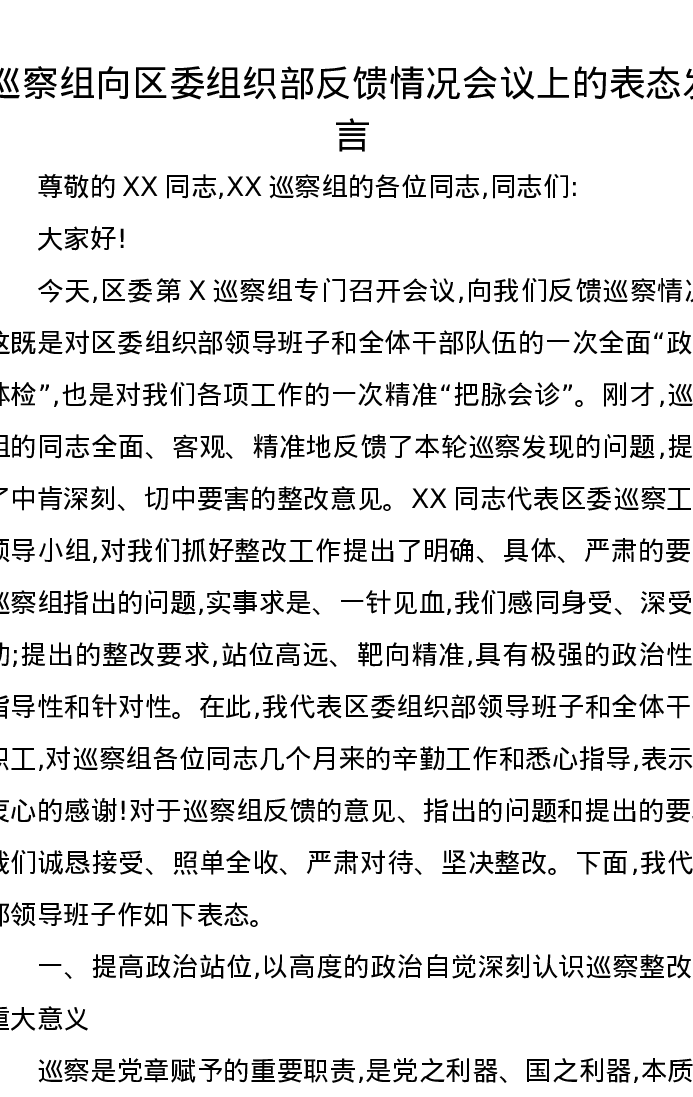 巡察组向区委组织部反馈情况会议上的表态发言