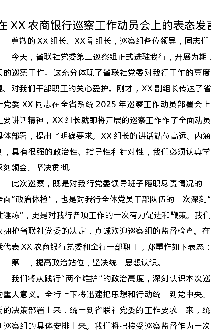 在XX农商银行巡察工作动员会上的表态发言