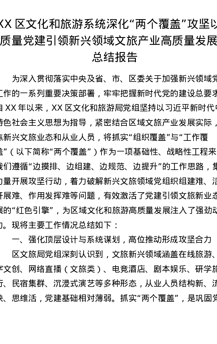 XX区文化和旅游系统深化两个覆盖攻坚以高质量党建引领新兴领域文旅产业高质量发展的总结报告