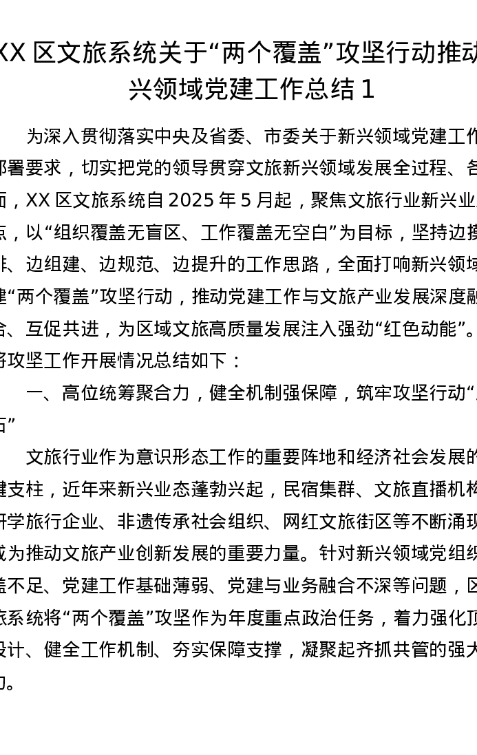 XX区文旅系统关于两个覆盖攻坚行动推动新兴领域党建工作总结
