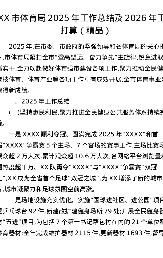XX市体育局2025年工作总结及2026年工作打算