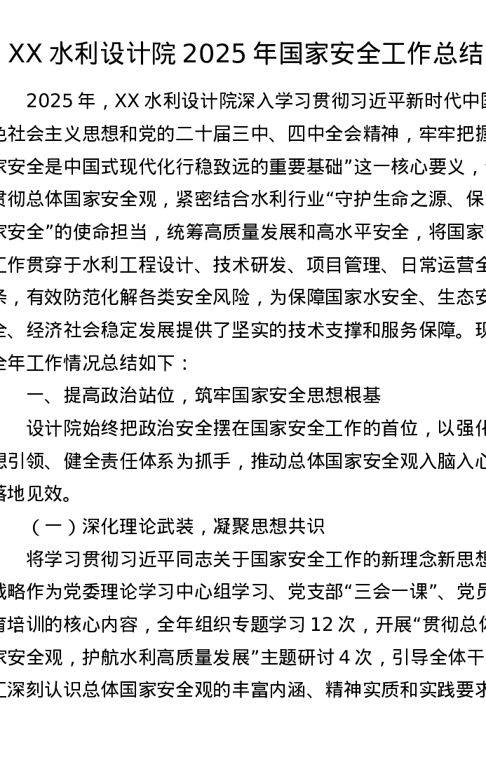 XX水利设计院2025年国家安全工作总结2