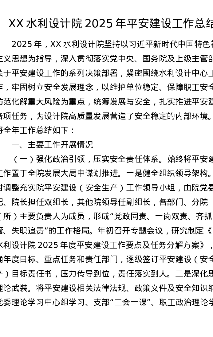 XX水利设计院2025年平安建设工作总结
