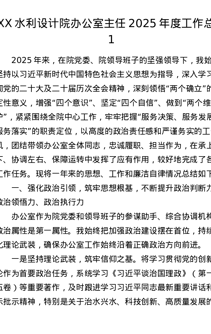 XX水利设计院办公室主任2025年度工作总结1