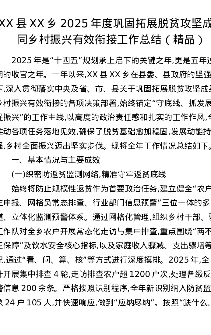 XX县XX乡2025年度巩固拓展脱贫攻坚成果同乡村振兴有效衔接工作总结