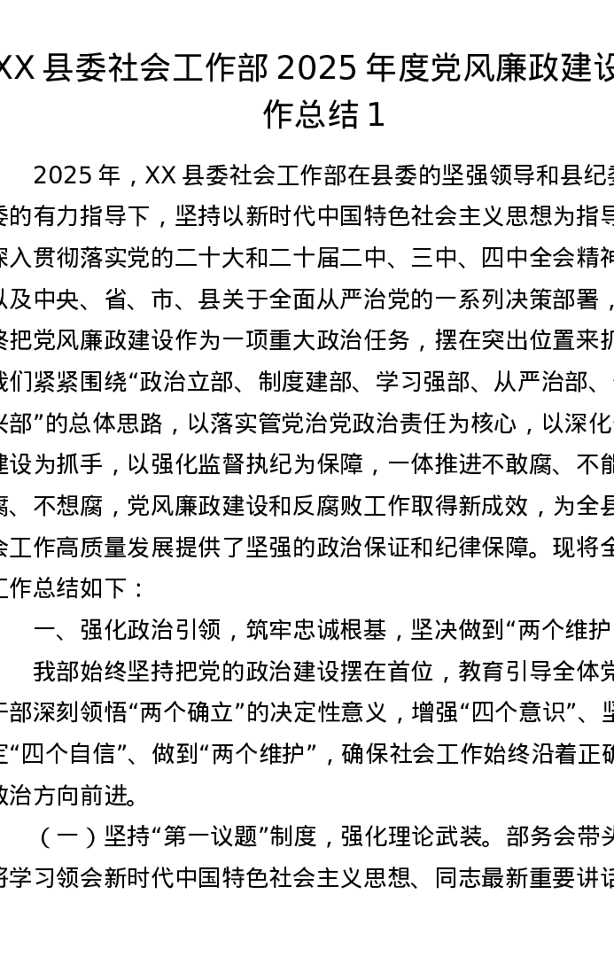 XX县委社会工作部2025年度党风廉政建设工作总结1