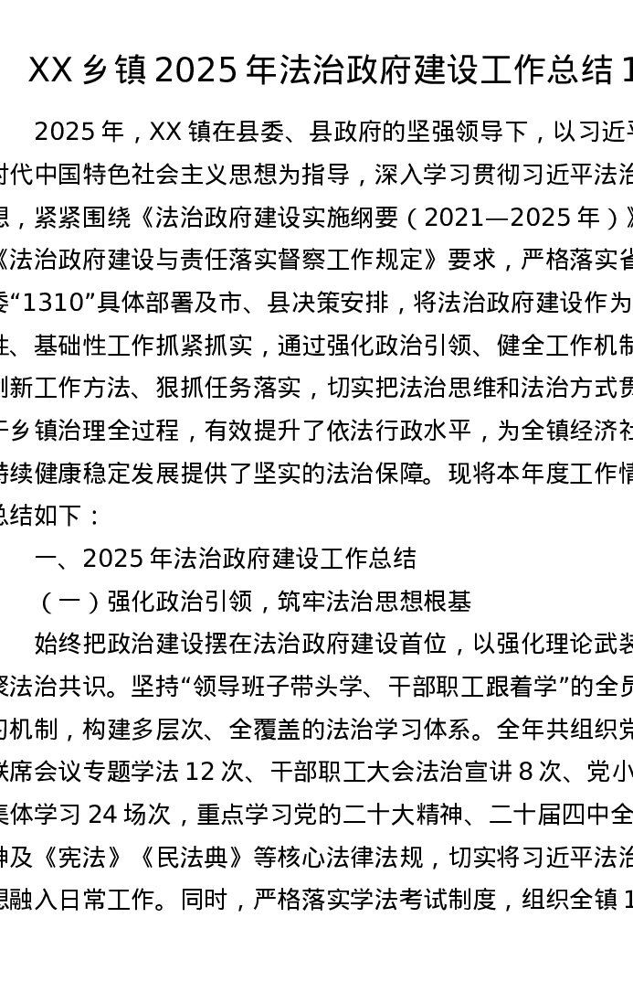 XX乡镇2025年法治政府建设工作总结1