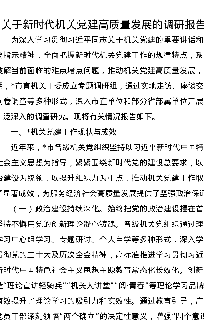 关于新时代机关党建高质量发展的调研报告