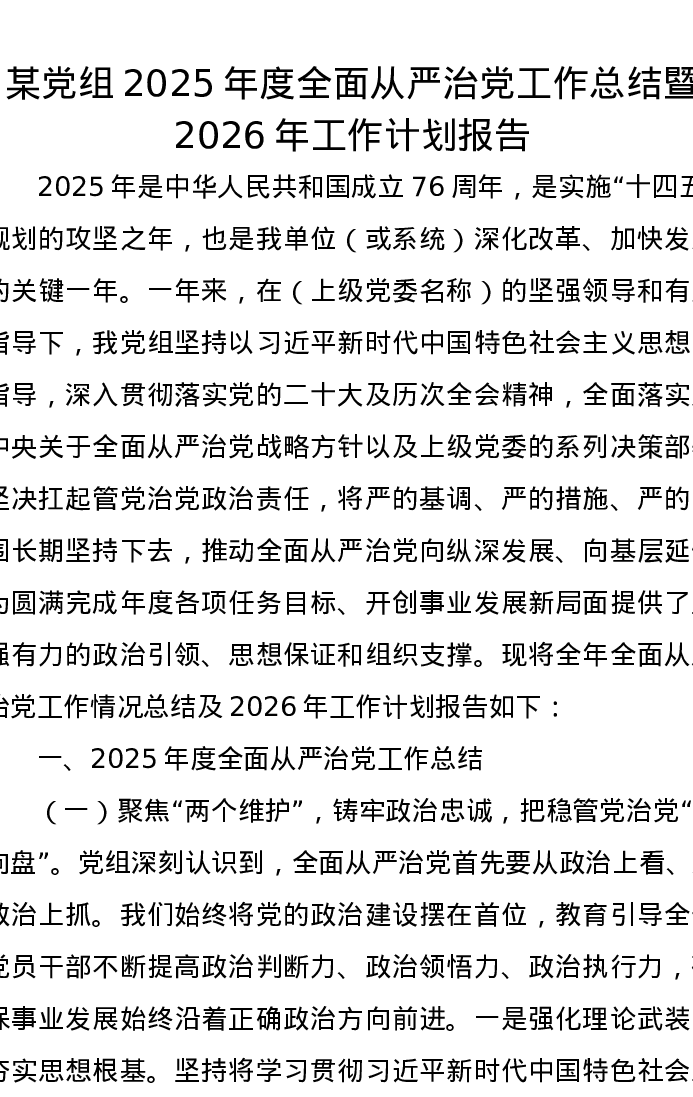 某党组2025年度全面从严治党工作总结暨2026年工作计划报告