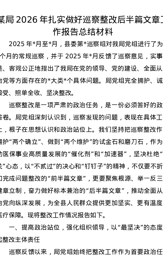 某局2026年扎实做好巡察整改后半篇文章工作报告总结材料