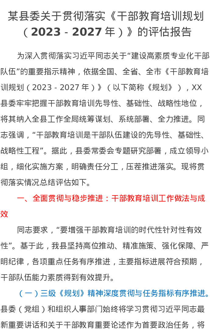 某县委关于贯彻落实《干部教育培训规划(2023-2027年)》的评估报告