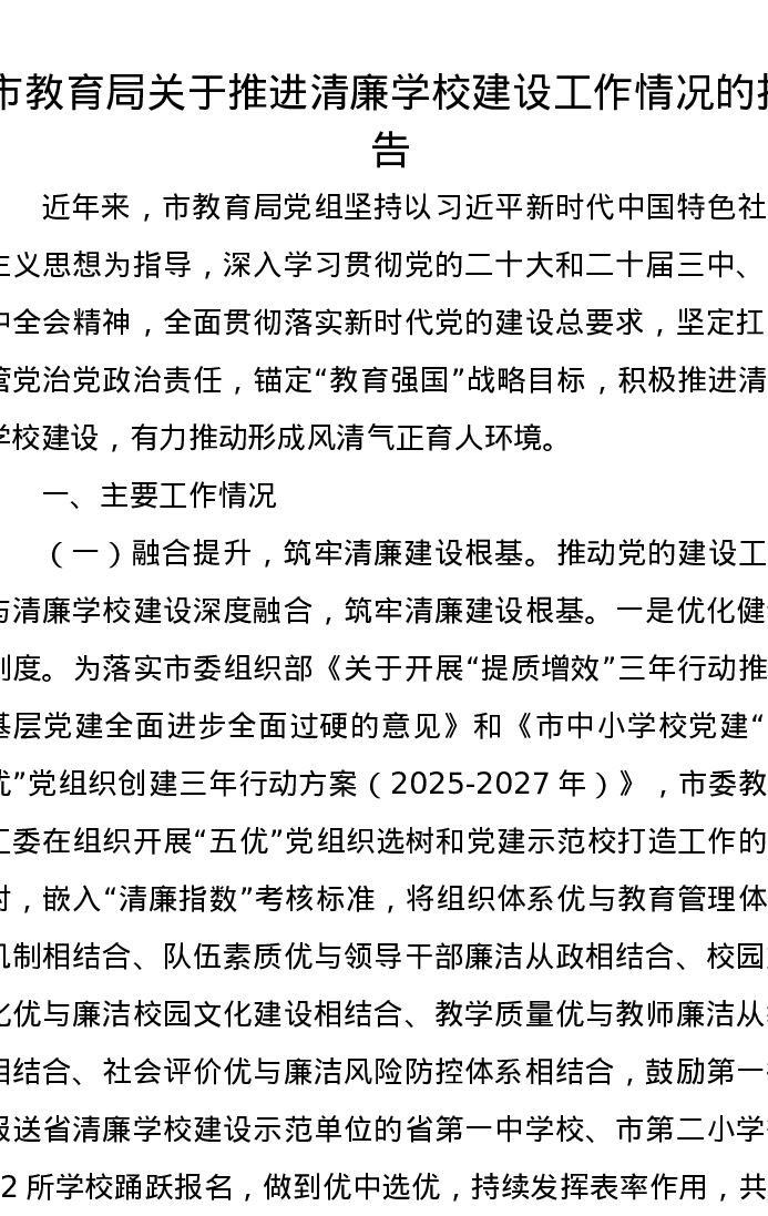 市教育局关于推进清廉学校建设工作情况的报告