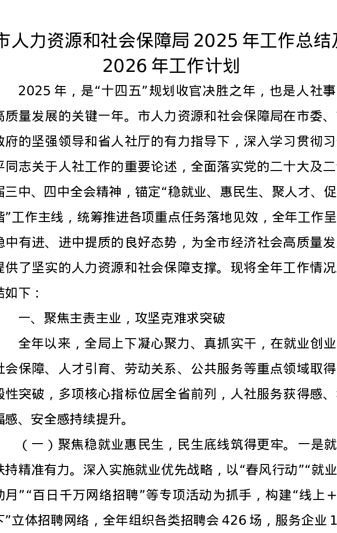 市人力资源和社会保障局2025年工作总结及2026年工作计划