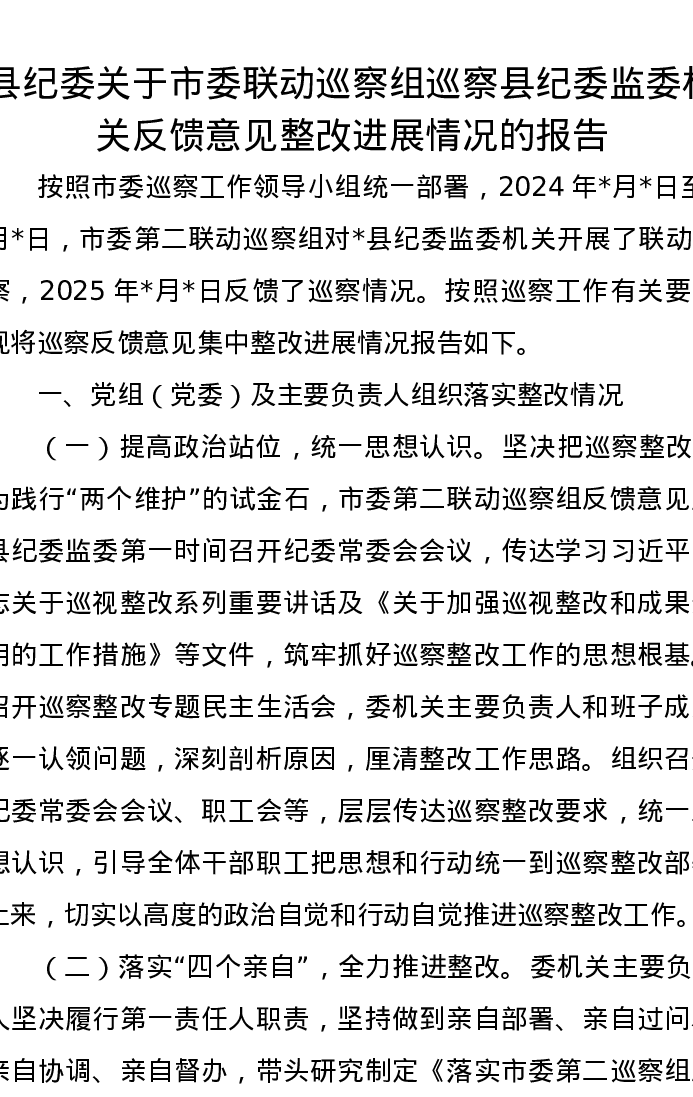 县纪委关于市委联动巡察组巡察县纪委监委机关反馈意见整改进展情况的报告