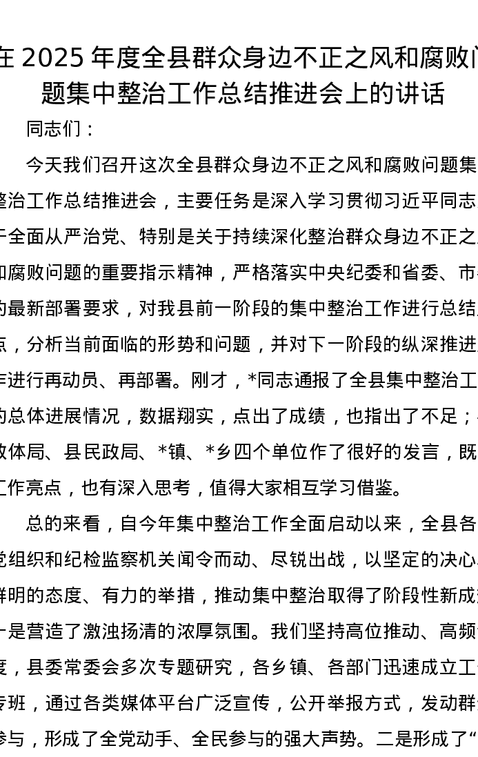在2025年度全县群众身边不正之风和腐败问题集中整治工作总结推进会上的讲话
