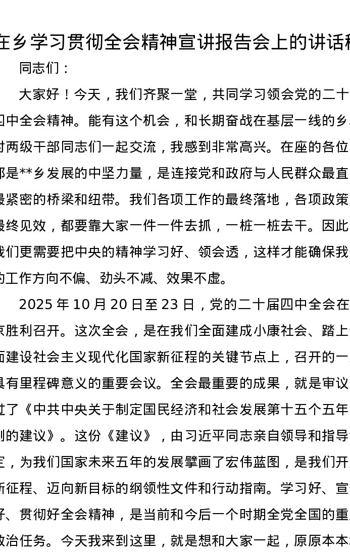 在乡学习贯彻全会精神宣讲报告会上的讲话稿