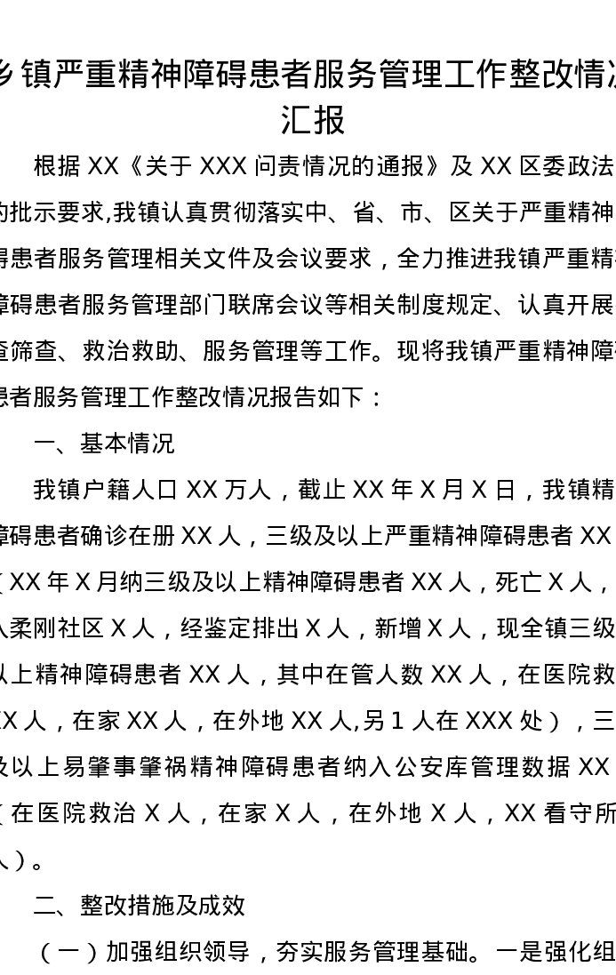 乡镇严重精神障碍患者服务管理工作整改情况汇报