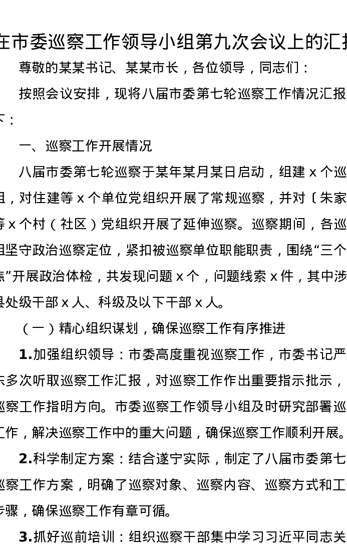 在市委巡察工作领导小组第九次会议上的汇报
