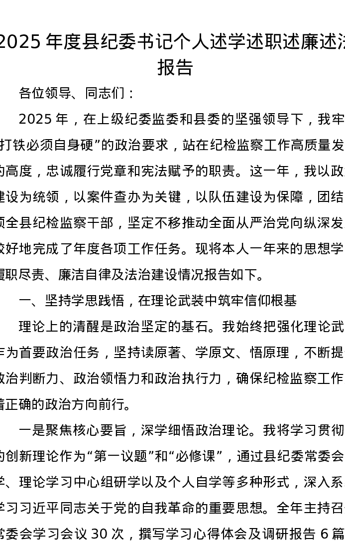 2025年度县纪委书记个人述学述职述廉述法报告