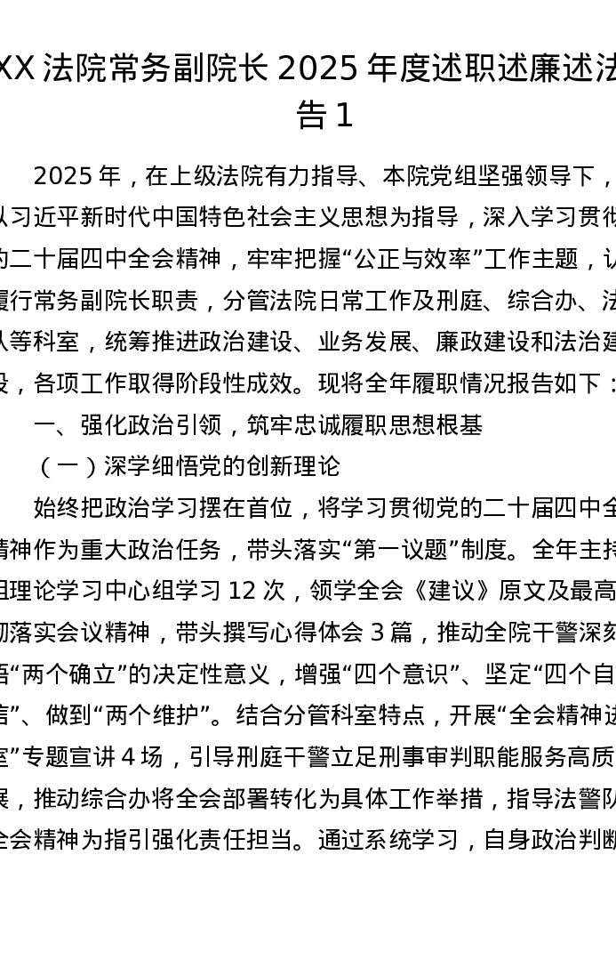 XX法院常务副院长2025年度述职述廉述法报告1