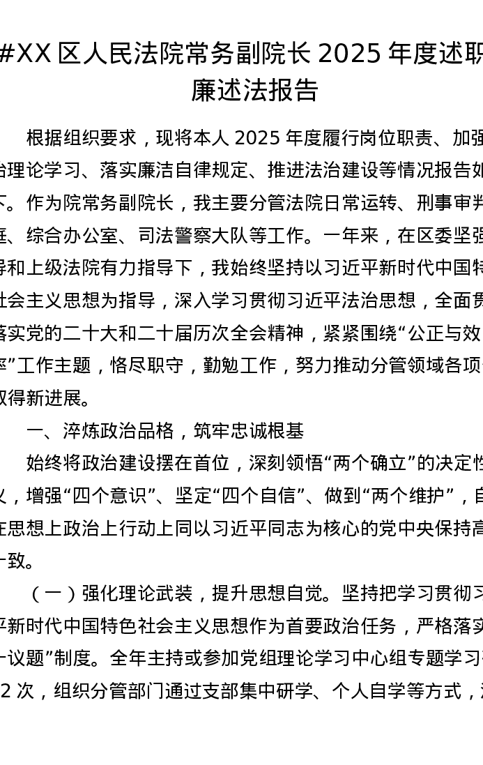 XX区人民法院常务副院长2025年度述职述廉述法报告
