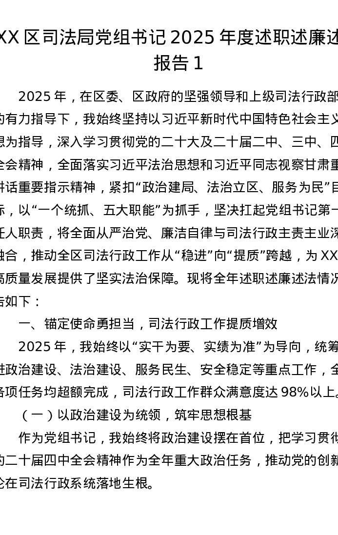 XX区司法局党组书记2025年度述职述廉述法报告1
