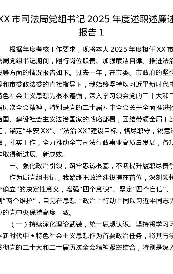 XX市司法局党组书记2025年度述职述廉述法报告1