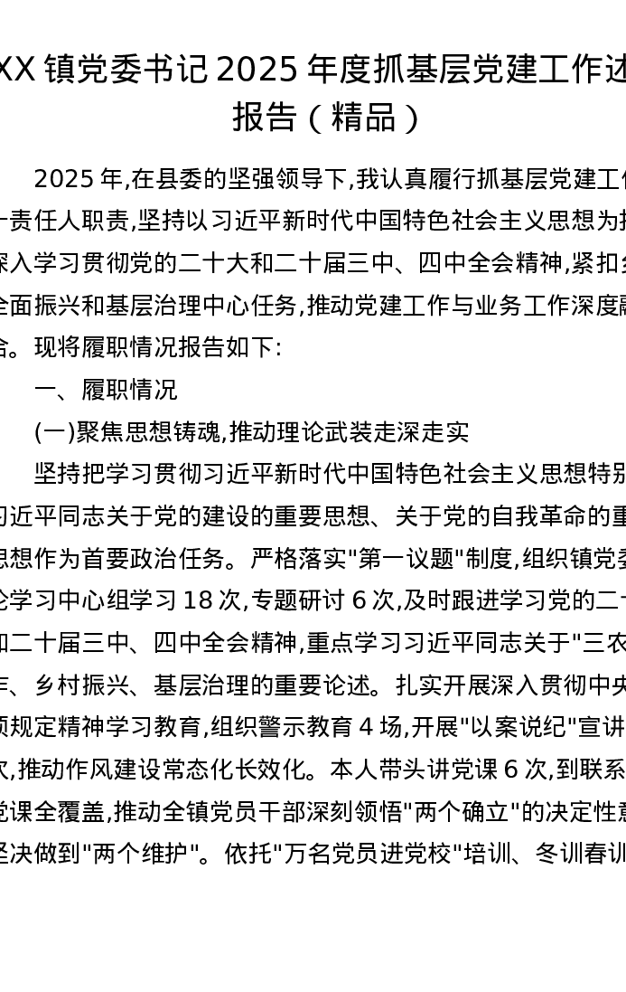 XX镇党委书记2025年度抓基层党建工作述职报告