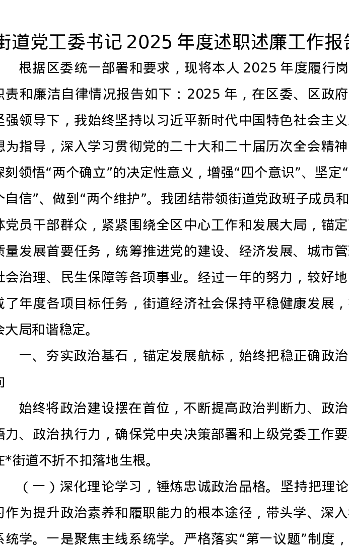 街道党工委书记2025年度述职述廉工作报告