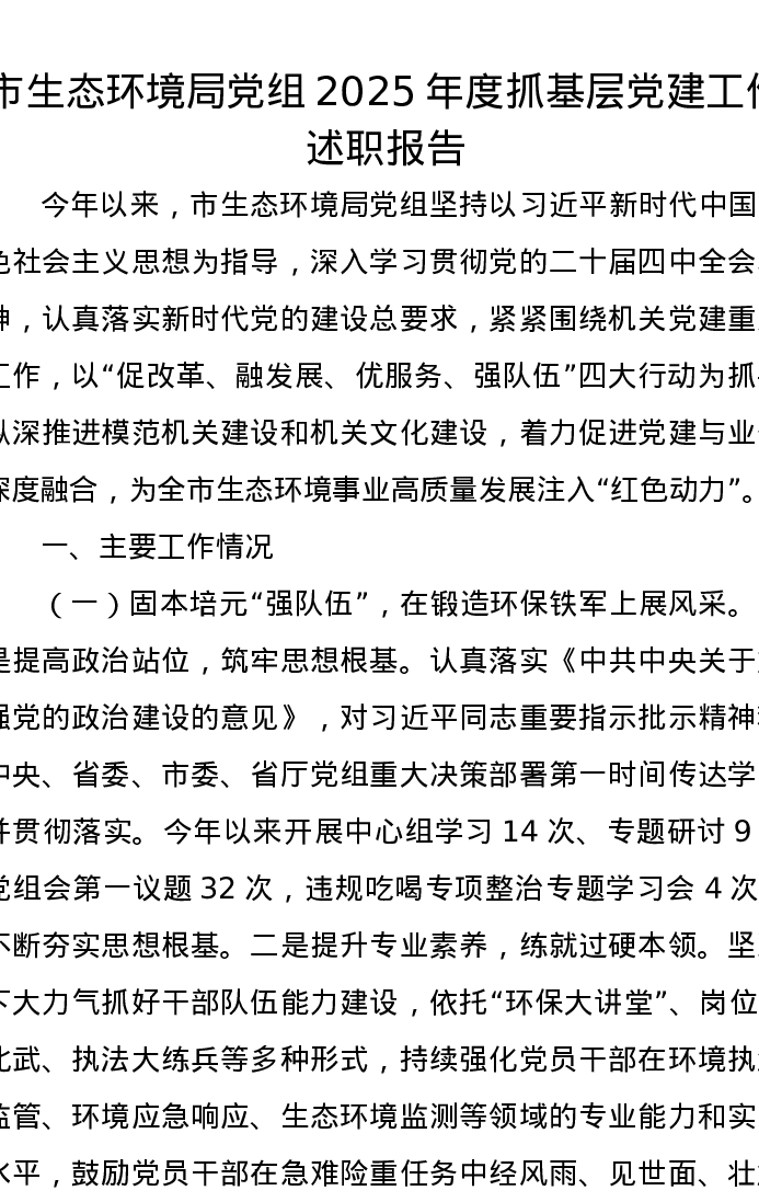 市生态环境局党组2025年度抓基层党建工作述职报告