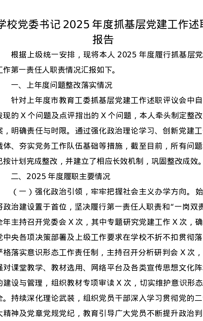 学校党委书记2025年度抓基层党建工作述职报告