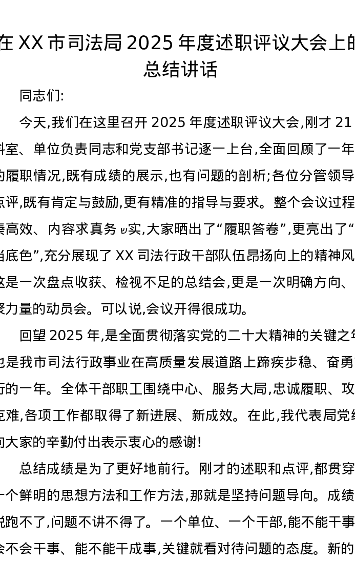 在XX市司法局2025年度述职评议大会上的总结讲话