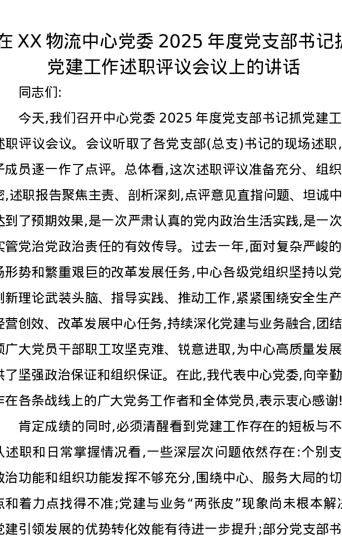在XX物流中心党委2025年度党支部书记抓党建工作述职评议会议上的讲话