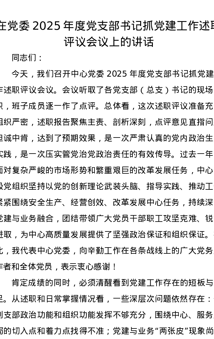 在党委2025年度党支部书记抓党建工作述职评议会议上的讲话