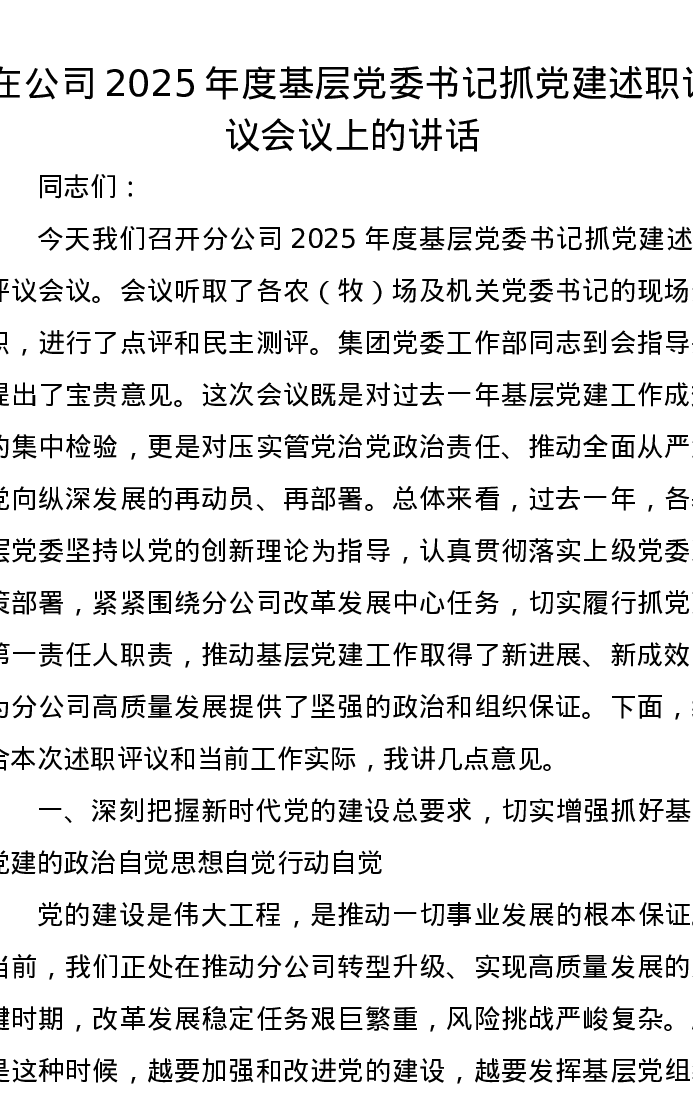 在公司2025年度基层党委书记抓党建述职评议会议上的讲话