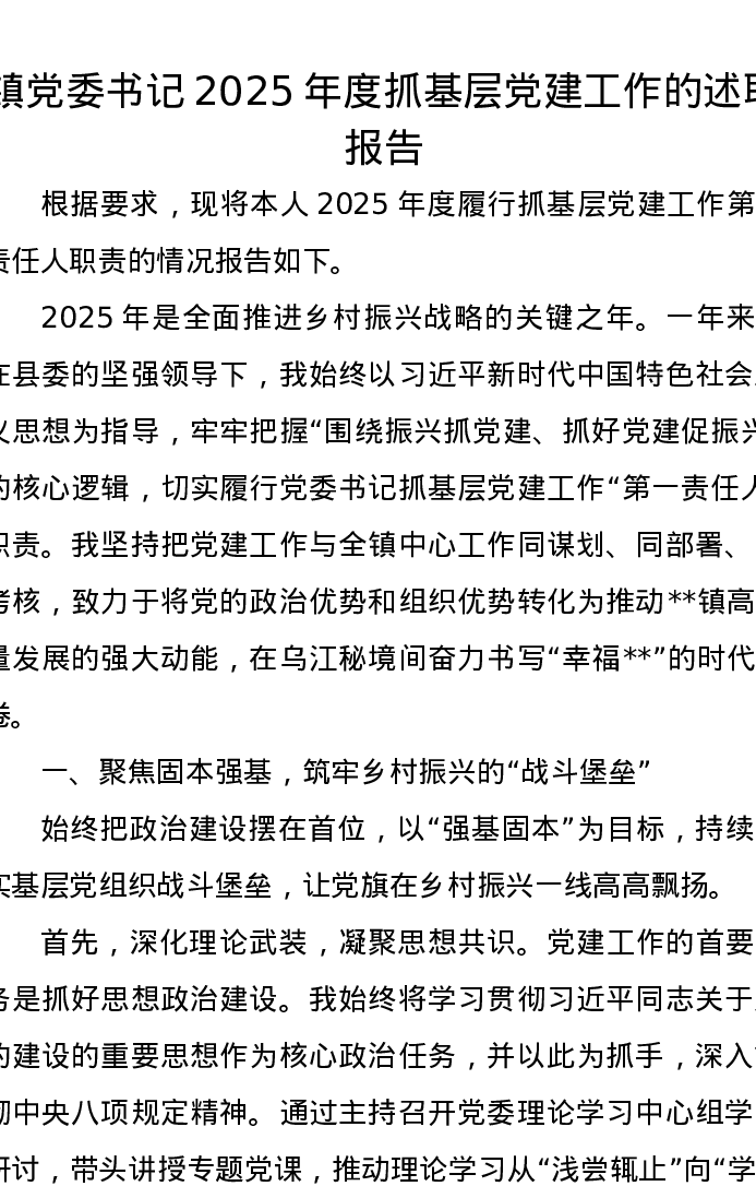 镇党委书记2025年度抓基层党建工作的述职报告