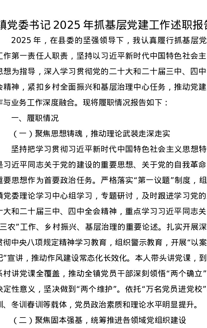 镇党委书记2025年抓基层党建工作述职报告