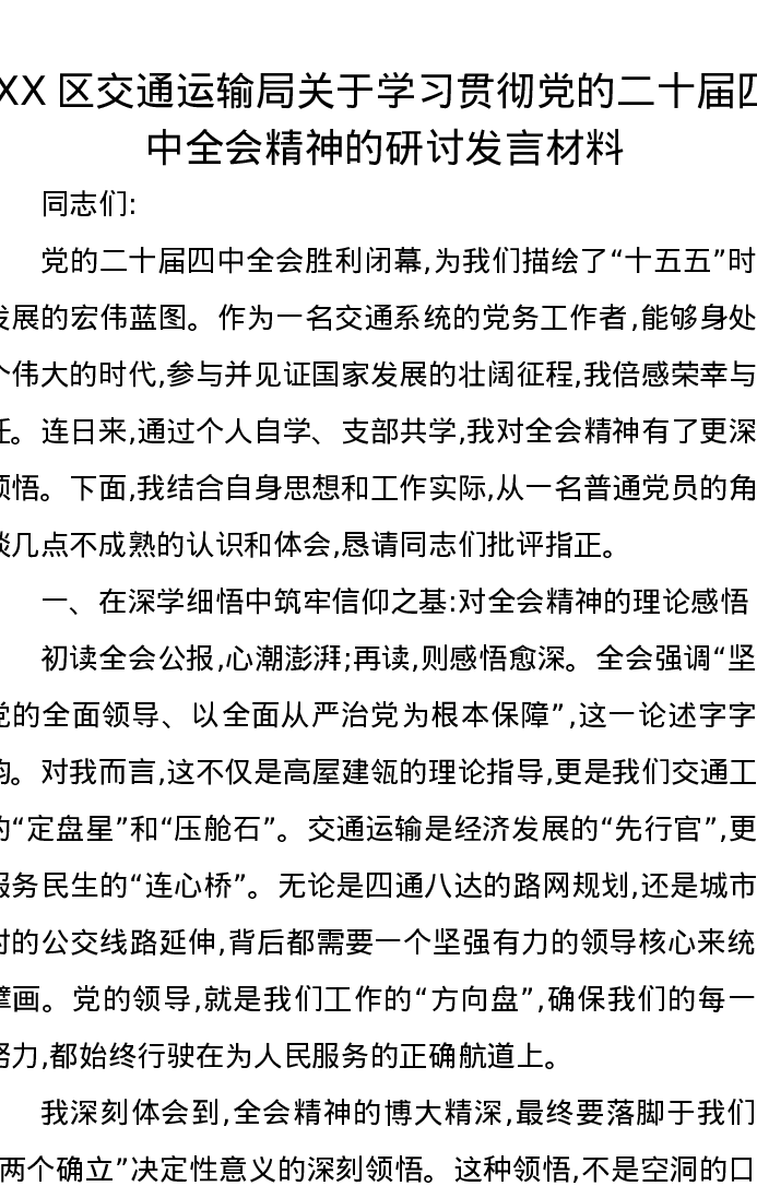 XX区交通运输局关于学习贯彻党的二十届四中全会精神的研讨发言材料