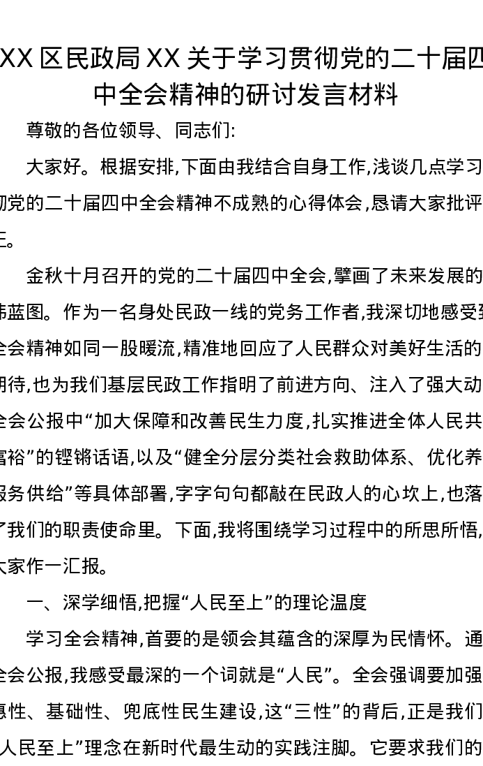 XX区民政局XX关于学习贯彻党的二十届四中全会精神的研讨发言材料