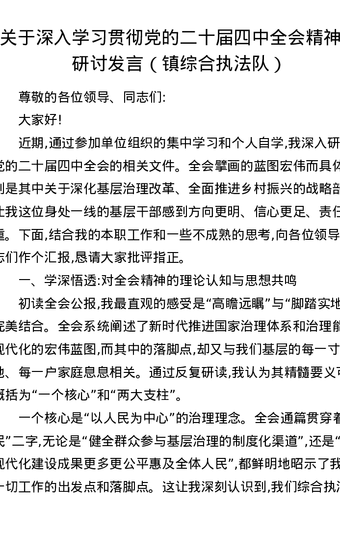 关于深入学习贯彻党的二十届四中全会精神的研讨发言(镇综合执法队)