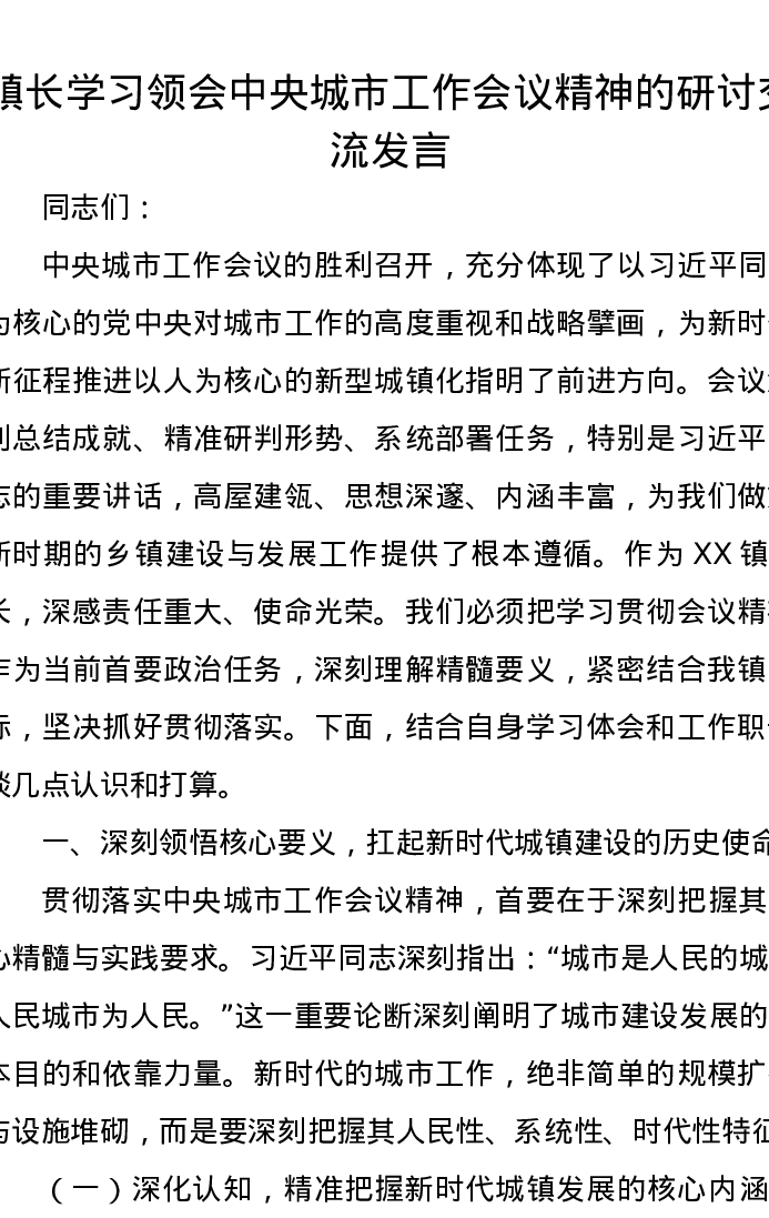 镇长学习领会中央城市工作会议精神的研讨交流发言