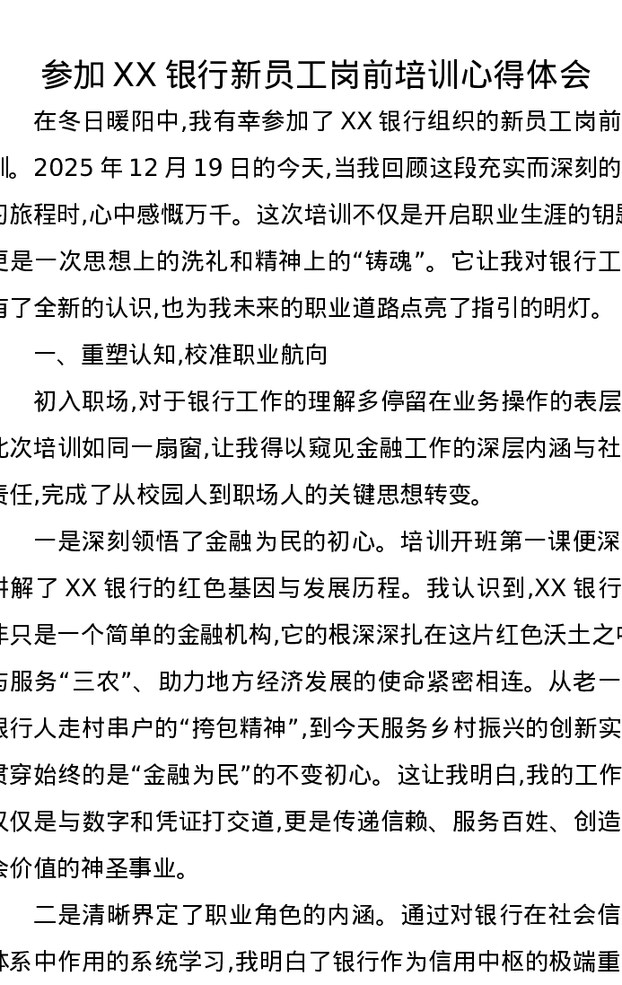 参加XX银行新员工岗前培训心得体会