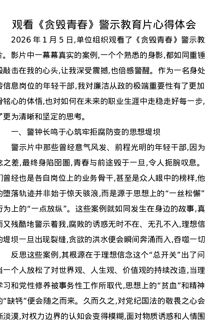 观看《贪毁青春》警示教育片心得体会